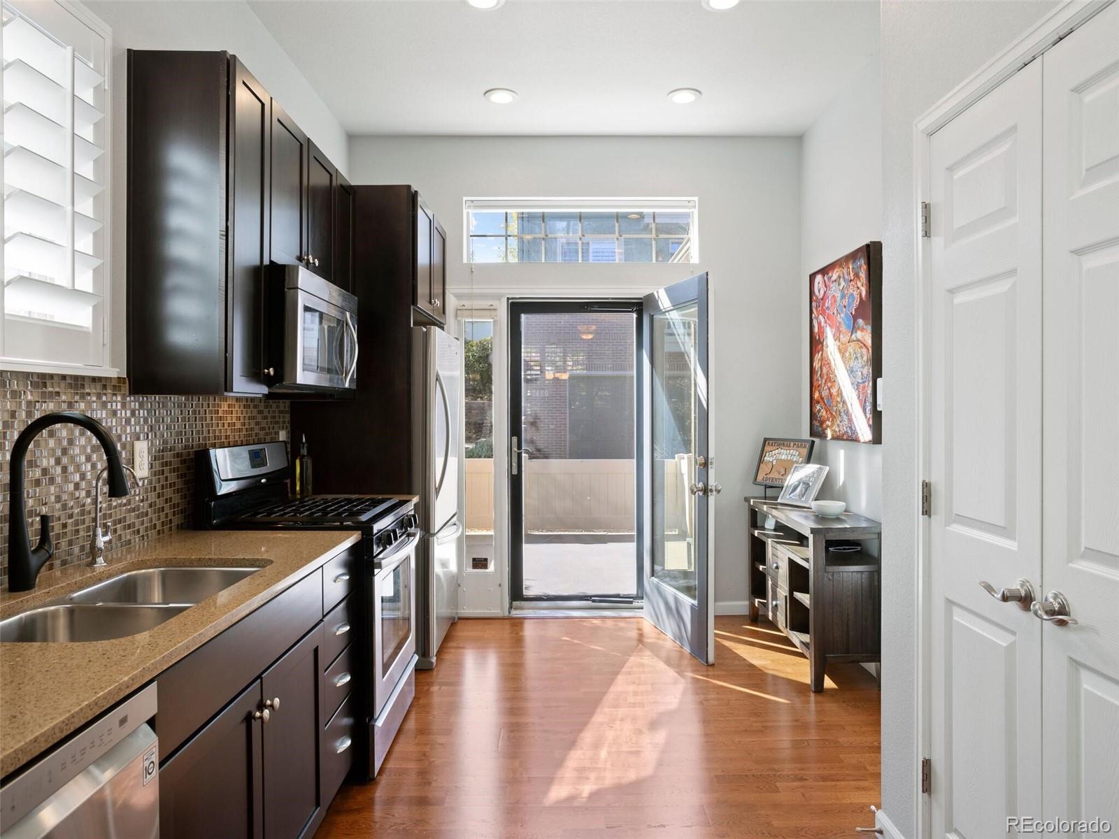 Crescent Ridge end unit townhome with primary main floor bedroom in Lowry! An architectural gem with the best curb appeal as it's elevated along 8th Avenue and walk-able to the park, trails and Lowry Town Center. End unit with front porch as well as the back patio with Southern exposure and attached 2-car garage for convenience. The open floor-plan offers high ceilings and great light while complimented by the plantation shutters throughout. The unit is particularly appealing to many given the main-floor primary suite! Further enjoy the walk-in closet along with the spacious primary bath, double vanity and linen closet. The kitchen offers quartz counter tops, includes all stainless steel appliance, pantry and new reverse osmosis system at the kitchen sink. Nice separation at the dining area as you look to entertain. All the conveniences on the main, including laundry. Upstairs offers two additional bedrooms, each with their own walk-in closets and a full hall bath with double vanity. Find added storage at the upper mechanical area also. Newer carpet and paint throughout. Lowry offers easy access to shopping, dining, parks, recreation and schools. Once of Denver's top urban neighborhoods to now call home!